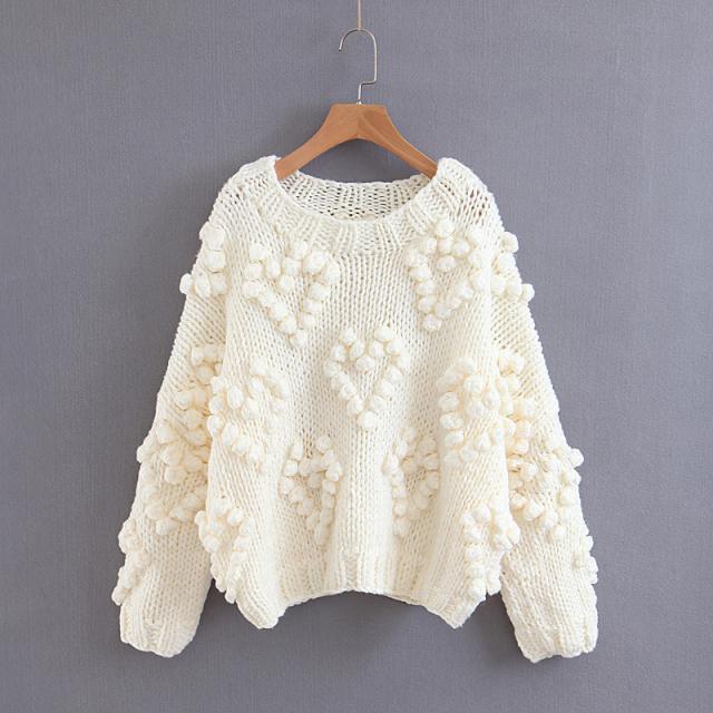 セーター ニット ラウンドネック 長袖 ボリューム袖 無地 ポンポン付き 大人可愛い ゆったり オーバーサイズ カジュアル 韓国ファッション 春夏 デート お出かけ 女子会 オシャレ トレンド ベーシック フェミニン レディース 白 グレー 赤