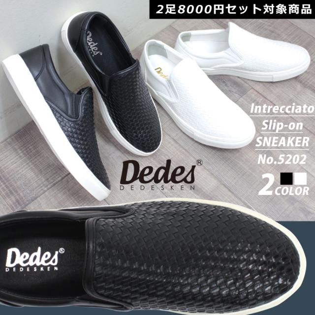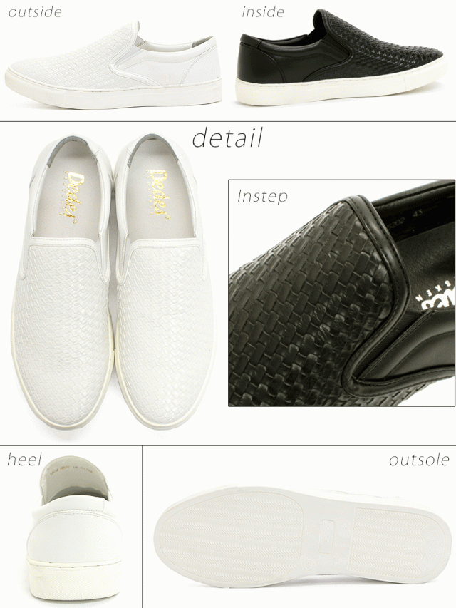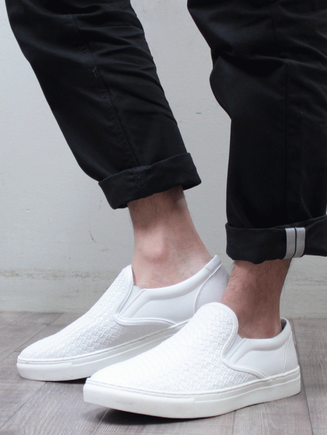 シンプルな「黒」「白」2色展開のイントレチャート型押しスリッポンスニーカー。