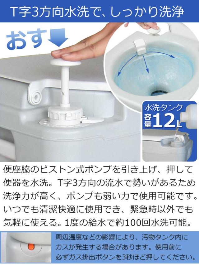 野外や緊急時でも快適に使える水洗式ポータブルトイレ ■水源不要、ピストン式ポンプで水洗可能 便座脇のピストン式ポンプを引き上げ、押して便器を水洗。いつでも清潔・快適に使用ができるので、緊急時以外でも気軽に使いやすい。ポンプは押しやすく、水洗もパワフル。ー度の給水で約100回の水洗可能。 ■座面が広く、座りやすいデザイン 実際の便器に近い、だ円形の便座。座面が広く、座りやすいので違和感なく使用できます。 ■持ち運び可能で多目的に使用可能 〇災害・緊急時 緊急時も簡単に持ち運び可能。 水を入れるだけで使用できるので、電源・水源を探す必要もありません。 〇介護・リハビリ 付近にー台あれば、卜イレまでの歩行補助も要らず、 足腰への負担も軽減できます。 〇旅行・アウトドア 車にー台積んでおけばヽ 旅行先や車中泊でも卜イレの設置場所を気にせず、キャンプやドライブの選択肢が広がります。 ■排泄レバーでニオイ漏れを防ぐ 側面の排泄レバーで汚水夕ンクを密閉。 使用後の気になる二オイ漏れを防ぎます。 ■取外し簡単、処理もラクラク 汚水夕ンクは本体から簡単に取外しが可能。 取手が付いて持ち運びや処理もラクラク。 ■容量メーターで汚水交換時期が確認できる ■たくさん使える大容量21L ■防災、震災、災害用対策品 自治会、協議会、町内会、公民館、青年会議所、婦人会などのさまざまな団体、都道府県市町村、業者様、企業様に一部導入していただきました。 防災や減災に関してさまざまなお取り組みをされている地域のご担当者様、是非ご検討下さい。 | ||||||||||