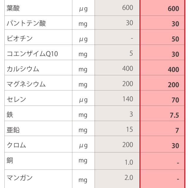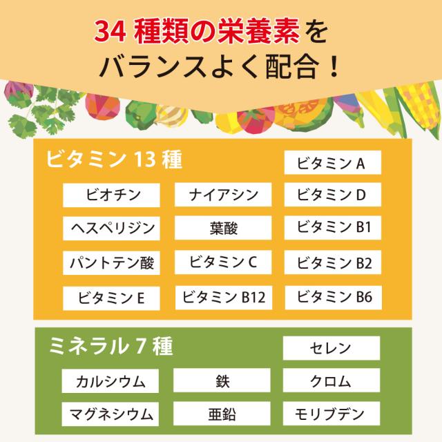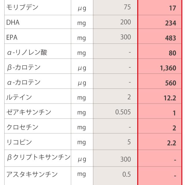 エネルギー40.87kcal、たんぱく質1.45g、脂質2.67g、炭水化物2.77g、食塩相当量 0.02g、カルシウム400mg、鉄7.5mg、マグネシウム200mg、セレン70μg、亜鉛7mg、クロム30μg、モリブデン17μg、ビタミンA 600μg、β-カロテン1360μg、ビタミンD 10μg、ビタミンE 149mg、ビタミンB1 9.5mg、ビタミンB2 10.5mg、ナイアシン40mg、ビタミンB6 12mg、葉酸600μg、ビタミンB12 40μg、ビオチン50μg、パントテン酸30mg、ビタミンC 500mg