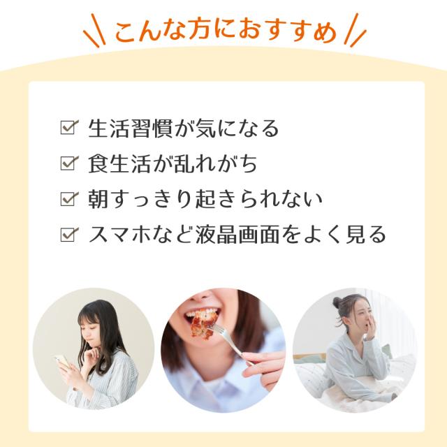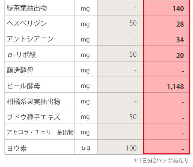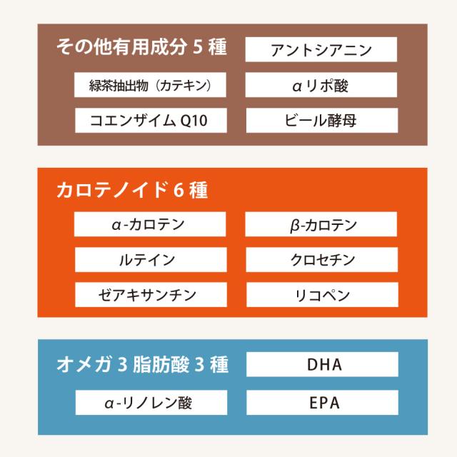 ビール酵母1148mg、緑茶抽出物140mg、コエンザイムQ10 30mg、α-リポ酸20mg、ヘスペリジン28mg、アントシアニン34mg、ルテイン12.2mg、ゼアキサンチン1mg、クロセチン2mg、リコペン2.2mg、α- カロテン560μg、EPA 483mg、DHA 234mg、α-リノレン酸80mg