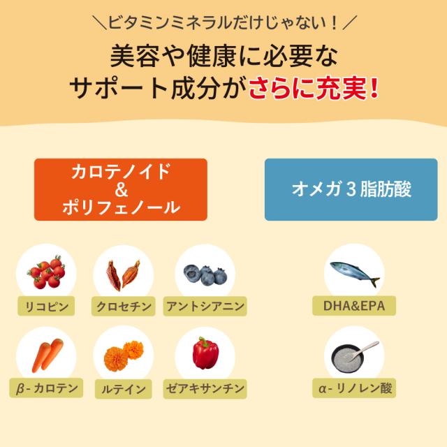 ビタミン、ミネラルの基本栄養素に、オメガ3系脂肪酸とサビ取りのちからで知られる6つのカロテノイドとポリフェノールをオールインワン。