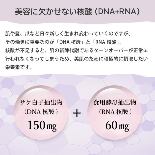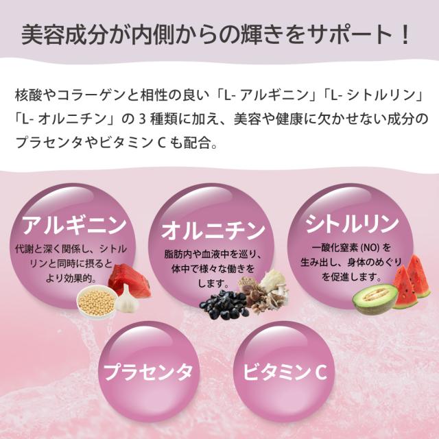 核酸(DNA・RNA)をベースにプラセンタ、Lアルギニン、Lオルニチン、Lシトルリンなどを配合。
