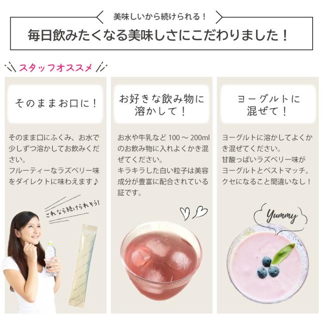 コラーゲンペプチド(ゼラチンを含む)(国内製造)、還元麦芽糖、デキストリン、L-シトルリン、L-オルニチン塩酸塩、さけ白子抽出物、RNA含有食用酵母抽出物、豚プラセンタエキス末、果糖、亜鉛酵母、コンドロイチン含有ムコ多糖体(豚由来)、ビルベリーエキス末、ラズベリー濃縮果汁、コーン胚芽抽出物/ビタミンC、L-アルギニン、クエン酸、香料、甘味料(アスパルテーム:L-フェニルアラニン化合物、アセスルファムカリウム)、ヒアルロン酸、赤ビート色素、ビタミンB2、ビタミンB1、ビタミンB6、ビタミンB12