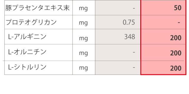 エネルギー 22.74kcal、たんぱく質 4.61g、脂質 0.02g、炭水化物 1.02g、食塩相当量 0.038g、亜鉛 3mg、ビタミンB1 1.2mg、ビタミンB2 1.2mg、ビタミンB6 1.2mg、ビタミンB12 2.4μg、ビタミンC 360mg、サケ白子抽出物(DNA含有) 150mg、食用酵母抽出物(RNA含有) 60mg、コラーゲンペプチド3.3g、コンドロイチン含有ムコ多糖体2.5mg、ヒアルロン酸1.7mg、豚プラセンタエキス末50mg、L-アルギニン200mg、L-オルニチン200mg、L-シトルリン200mg