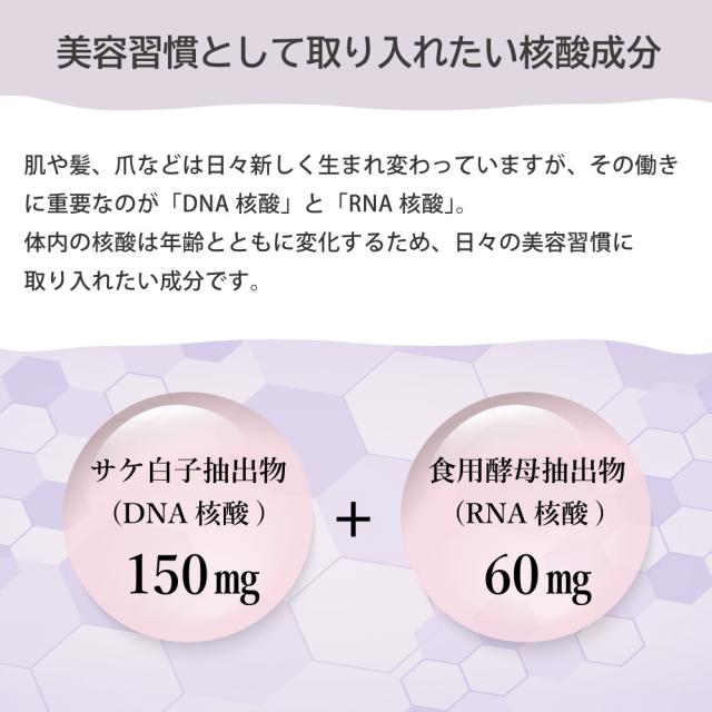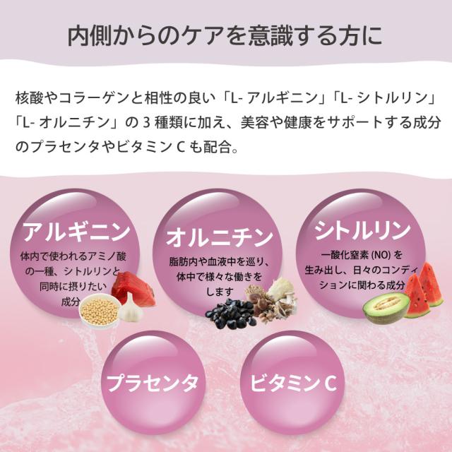 核酸(DNA・RNA)をベースにプラセンタ、Lアルギニン、Lオルニチン、Lシトルリンなどを配合。