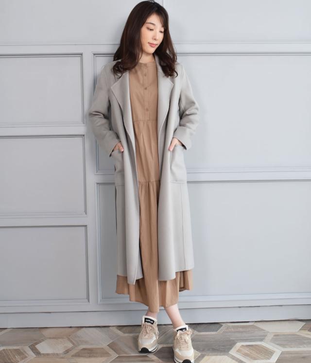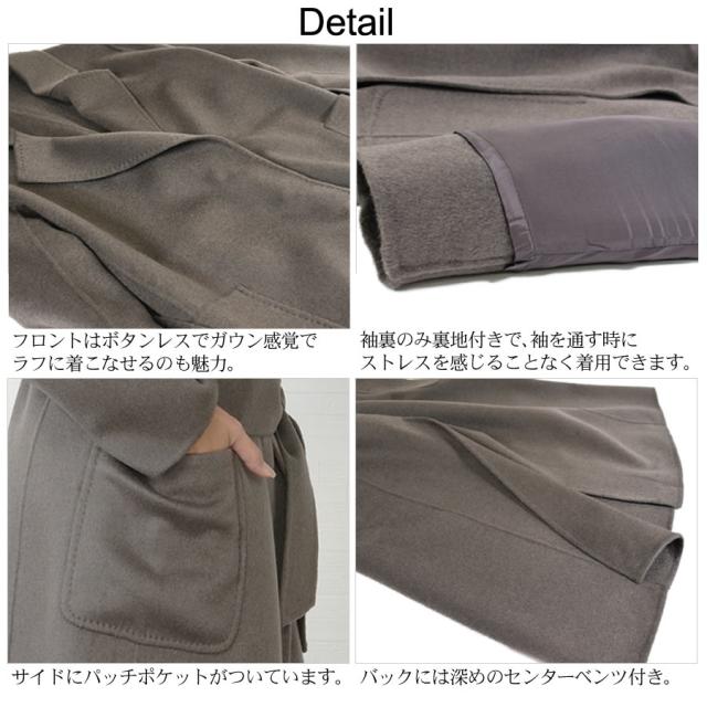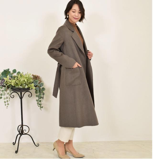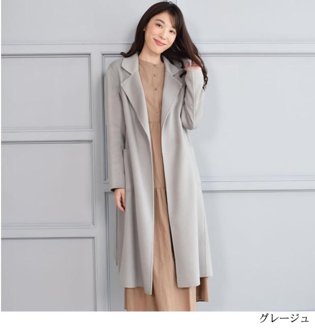極上のカシミヤ生地と丁寧なて仕事から生まれた、美しく上質なダブルフェイスコート。柔らかで滑らかな肌触りと光沢、生地を2枚重ねたダブルフェイスで肩のこらないしなやかな軽さと空気を多く含み暖かさを実現した、上品でエレガントな優しさを印象づける一着です。ボタンレスのガウン風のデザインでさっと羽織るだけでカッコよく決まり、共生地ベルトでウエストマークするときちんと感が出て装いが引き締まります。
