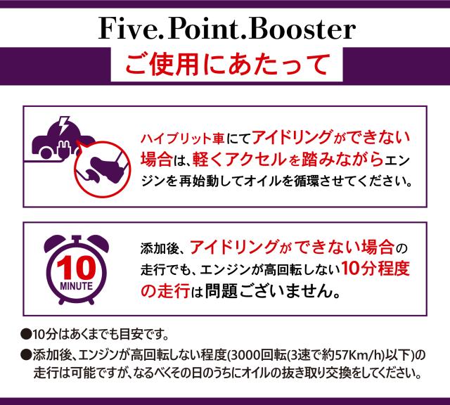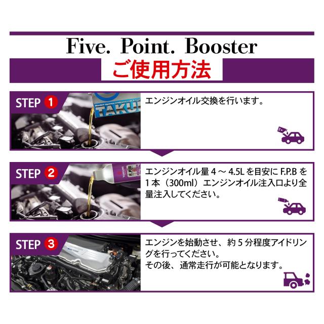製品名:Five.Point.Booster-ファイブ・ポイント・ブースター(F.P.B) 容量:300ml×3本セット 用途:エンジンオイル性能向上添加剤(4サイクルガソリン・ディーゼルエンジン用)