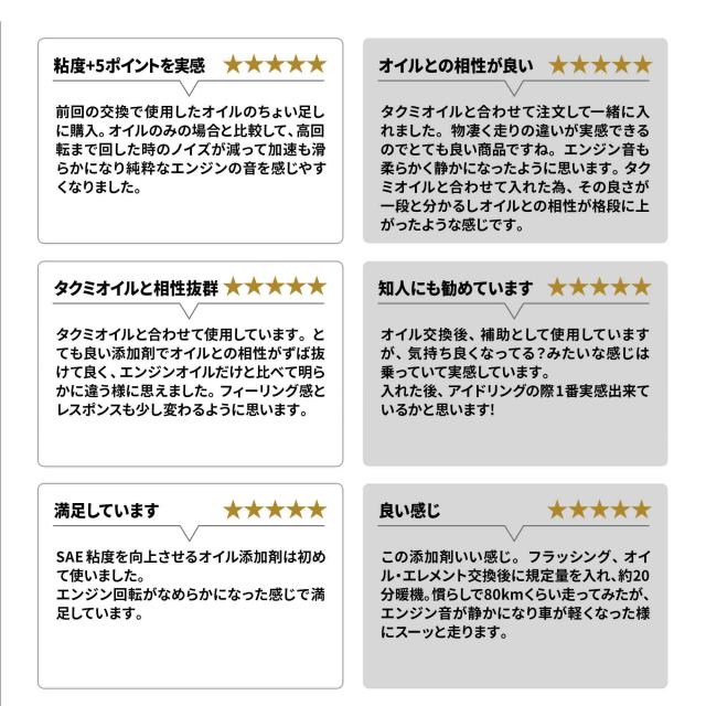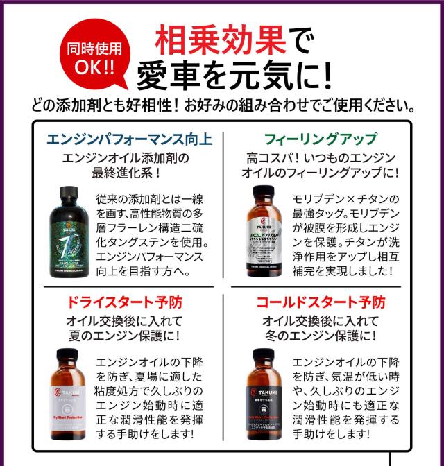 エンジン馬力トルクアップ 燃費改善 燃費向上 駆動性 始動性 エンジン音低減 加速 潤滑性 冷却性能 清浄性 防腐性 気密性 熱安定性 オイル下がり オイル上がり 摩擦低減 カーボン除去 スラッジ防止 エンジンオイル寿命 ガソリンエンジン ディーゼルエンジン ハイブリッド ターボエンジン