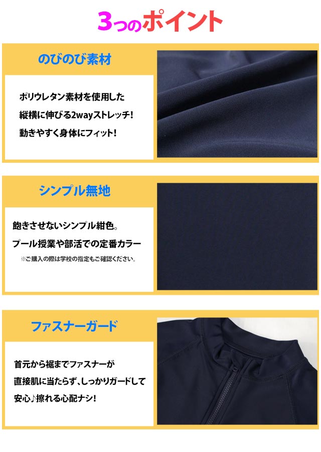 | 商品説明 | サイズ展開:120cm 130cm 140cm 150cm 160cm 170cm 対象:女の子 男の子 女子 男子 子供 キッズ ジュニア タイプ:半袖 ファスナー全開 適用:プール授業 学校水着 ネイビー無地 ・紫外線カットUPF50+ ・ファスナーガード付き 日焼けはもちろん寒さ対策にもどうぞ |