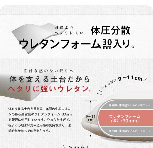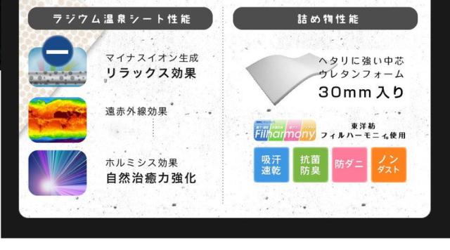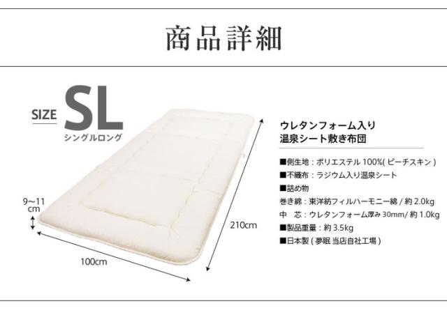 商品名:ラジウム温泉シート入りウレタンフォーム四層敷き布団 サイズ:150 x 210cm (シングルロング) 厚 み:しっかり厚み 9〜11cm 不織布:ラジウム温泉シート 特 徴:マイナスイオン生成,遠赤外線効果,ホルミシス効果 重 量:全体 約3.5kg 中 綿:フィルハーモニー ポリエステル綿 ( 約1.5kg ) 生 地:ポリエステル100%(ピーチスキン加工) 生産国:日本製 -------------------------------------------------