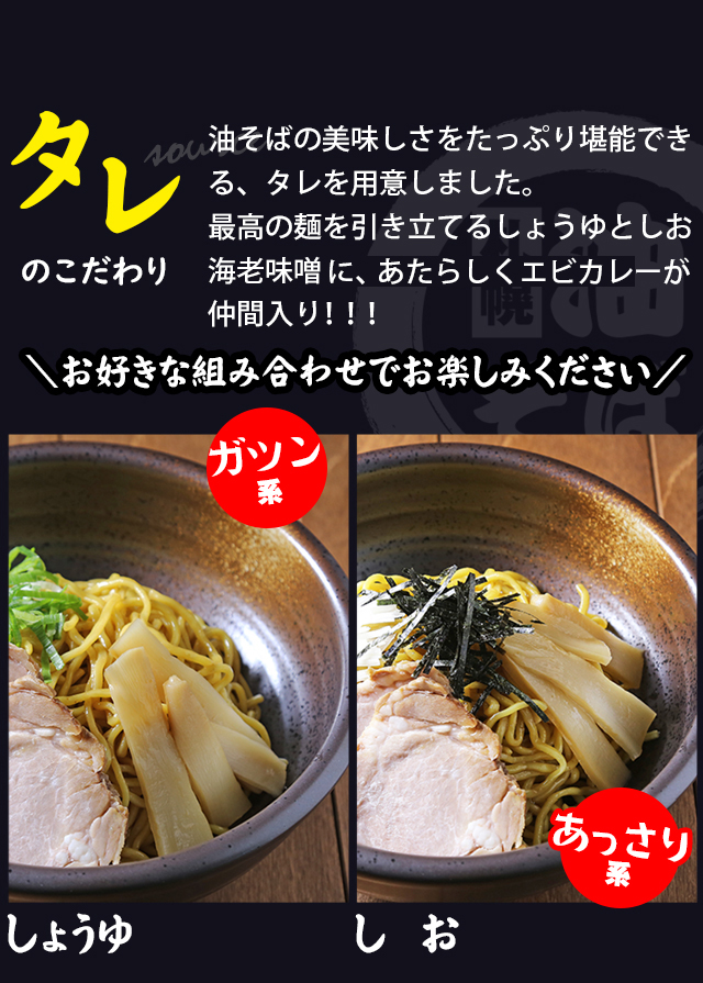 安心安全な北海道小麦で作った麺の風味。タレの組み合わせが選べる、他では味わえないボリュームたっぷりの油そばです。