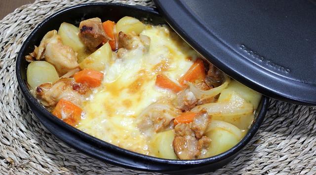 材料:鶏もも肉、玉ねぎ、ジャガイモ、人参、ごま油、とろけるチーズ、コチュジャン、酒、砂糖、おろし生姜
