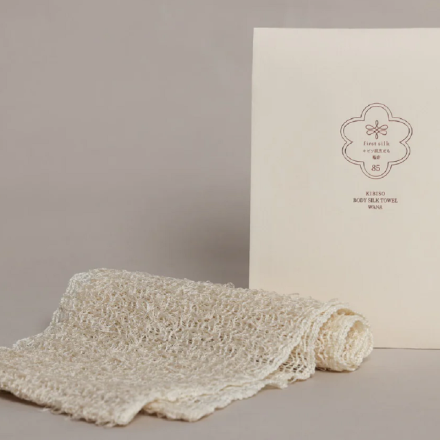 「絹糸」と「キビソ」を編み込んで作った、シルク100%のタオルです。