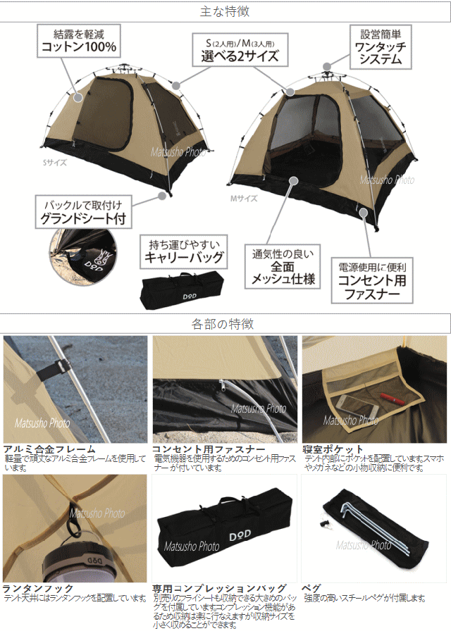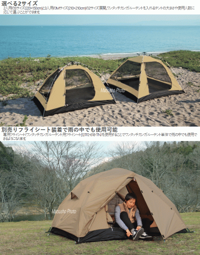 大型テントの中に就寝用の小型テントを入れ込むカンガルースタイルのキャンプ。暖房効率が良くレイアウトもしやすい等の理由から急増しています。ワンタッチカンガルーテントはその名の通りそのカンガルースタイル専用のテントです。カンガルースタイルではフロア以外には基本的に防水性が必要ないためコットン100%生地を使用し結露を最大限に抑えて快適なテント内空間を実現しています。ワンタッチ構造を採用しているため大型テントを設営した後でも簡単に設営する事ができます。■カラー:タン■組立サイズ(外寸)約W220×D150×H128cm■インナーサイズ:なし■収納サイズ約直径21×長さ70cm■重量約4.3kg(付属品含む)■収容可能人数大人2名■材質[壁面]コットン[フロア]210Dポリエステル(PUコーティング)[フレーム]アルミ合金■最低耐水圧5000mm※フロアのみ■セット内容:テント×1、グランドシート×1、ペグ×4、ペグ収納袋×1、キャリーバッグ×1、タイベルト×1