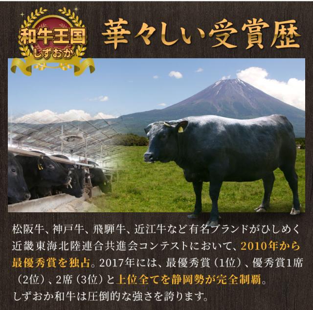 静岡県産の牛肉は、近畿東海北陸連合肉牛共進会において2010年から最優秀賞をほぼ独占。松坂牛、神戸牛、飛騨牛、近江牛など有名ブランドがひしめく中、圧倒的な強さを誇ります。