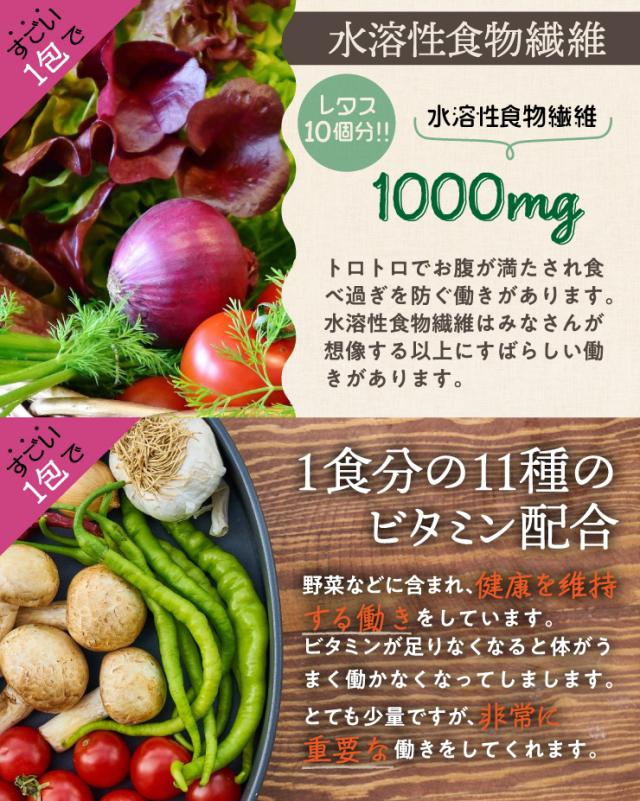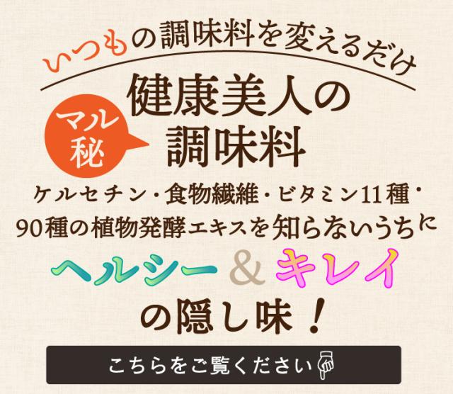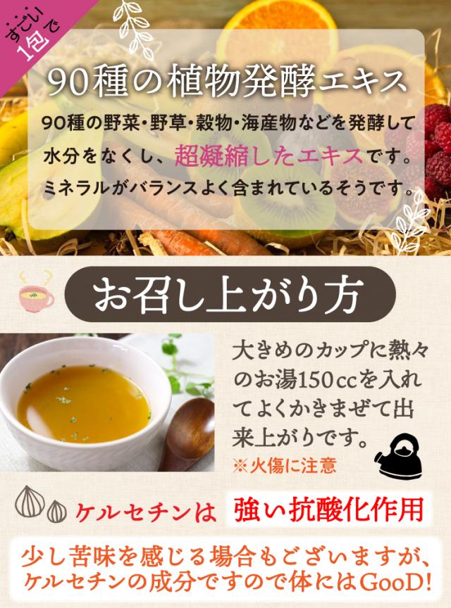 難消化性デキストリン、食塩、オニオンパウダー、砂糖、粉末しょうゆ、チキンパウダー、ガーリックパウダー、ポークパウダー、胡椒、ジンジャーパウダー、90種の植物発酵エキス、うきみ(パセリ)/調味料(アミノ酸等)、ケルセチン、増粘剤(グァーガム)、(一部に小麦・大豆・鶏肉・豚肉を含む)