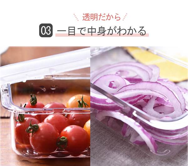 透明だから中身が一目瞭然、冷蔵庫からの出し入れもしやすいです。食材も鮮やかに映えて見えるから、そのまま器として食卓へ出していただくこともできます。