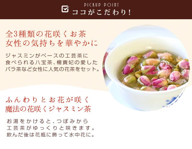 | 内 容 量 | ・工芸茶 1個<10種のうちからランダムで1個> ・八宝茶 25g×1P ・バラ茶 10g×1P ・お茶の淹れ方のしおり 1枚 |