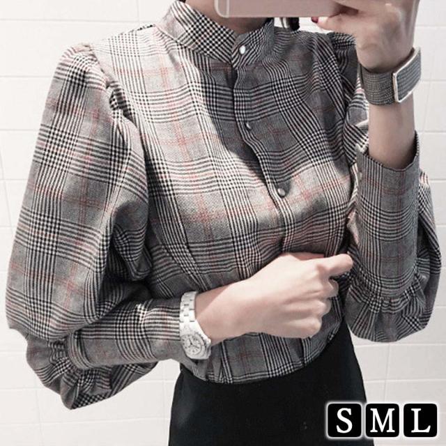 LAZA ブラウス オルチャン レディース グレンチェック柄 トップス 立ち襟 ウエストリボン シャツ