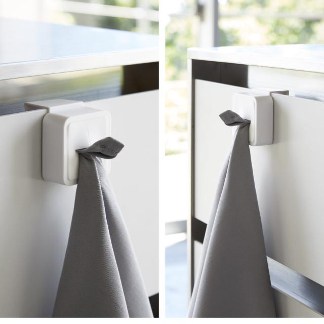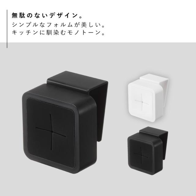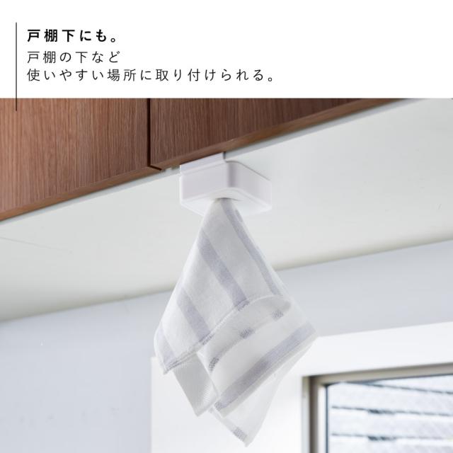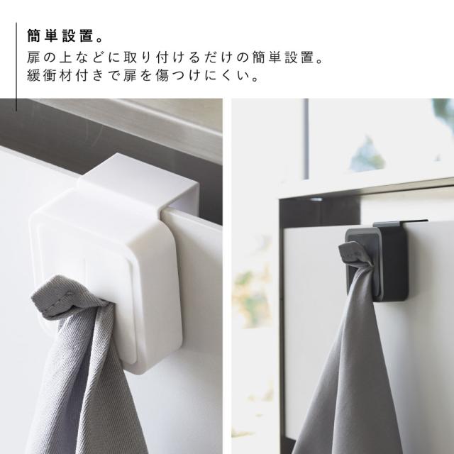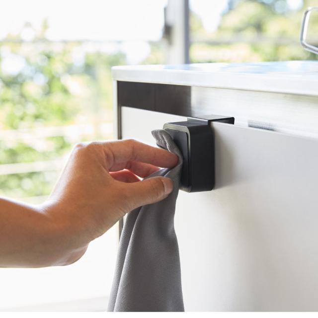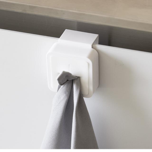 シンク扉に簡単取り付け。タオルや布巾を指で差し込むだけのタオルホルダー。シンク下や戸棚下、洗面所、サニタリーなど、扉などに取り付けるだけの簡単設置。緩衝材付きで扉を傷つけにくい。