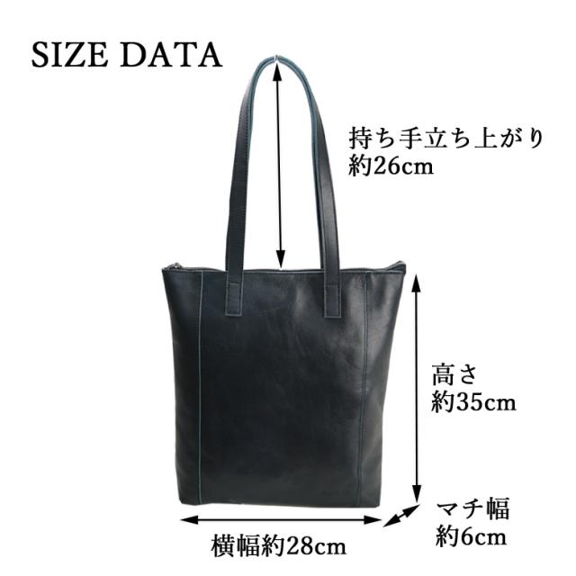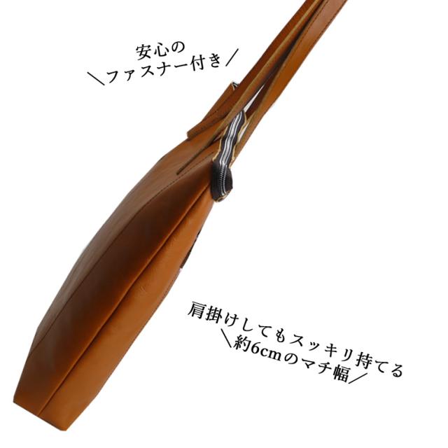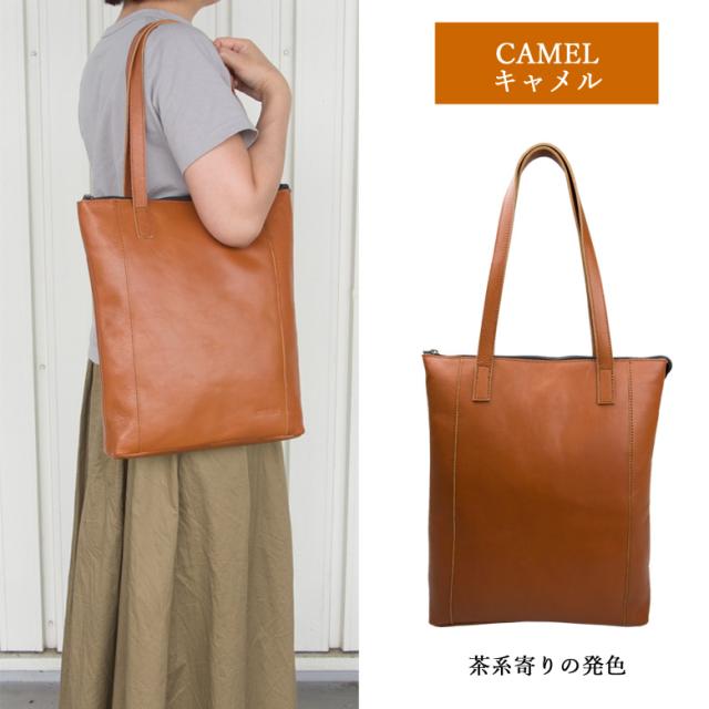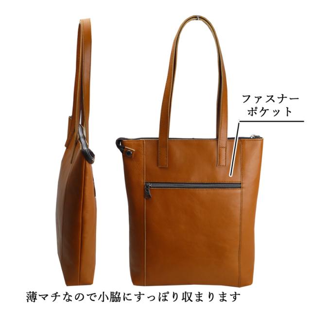 縦型のシンプルなレザートートバッグ。薄マチで掛けやすくファスナー開閉で機能的。