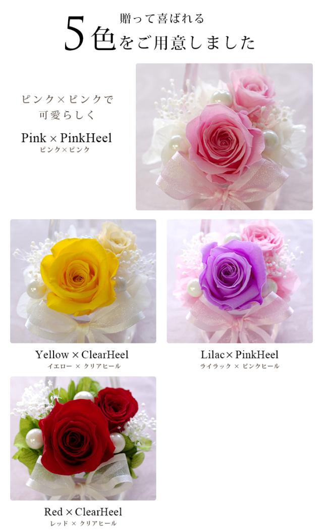 プリザーブドローズ、アジサイ、カスミ草、パールピック、リボン、ハイヒール(アクリル樹脂製)