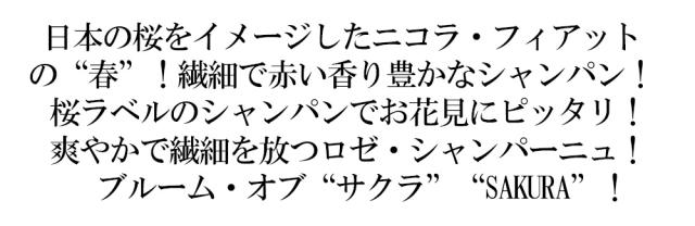 日本の桜をイメージしたニコラ・フィアットの“春”!繊細で赤い香り豊かなシャンパン!桜ラベルのシャンパンでお花見にピッタリ!爽やかで繊細を放つロゼ・シャンパーニュ!ブルーム・オブ“サクラ”“SAKURA”!■さまざまなギフトアイテムをご用意しております。お中元 ギフト 御中元 お盆 お礼 敬老の日 クリスマス 冬ギフト お歳暮 御歳暮 お年賀 御年賀 お正月 年末年始 ご挨拶 バレンタイン ホワイトデー お返し 父の日 母の日 ギフト 贈答品 お土産 手土産 御祝 御礼 内祝い 引き出物 お祝い 結婚祝い 結婚内祝い 出産祝い 出産内祝い 引き菓子 快気祝い 快気内祝い 進学祝い 誕生日祝い バースデーケーキ プレゼント Wedding ウェディング ホームパーティ お花見 パーティ 退職ギフト 退職 就任祝い