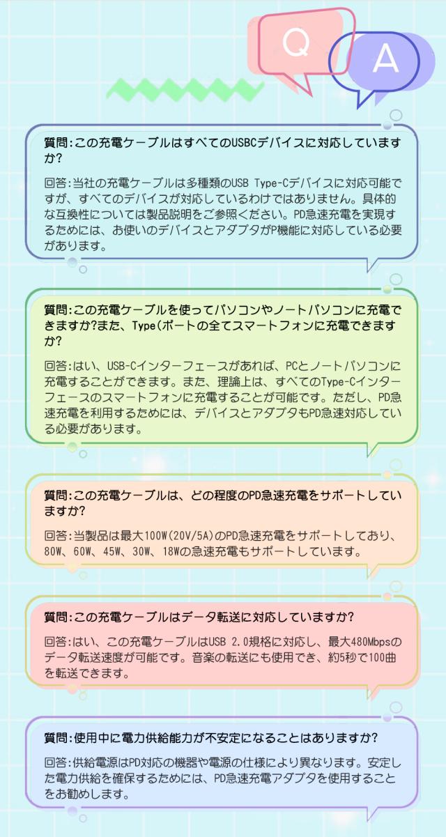 | Q1. 60Wモデルと100Wモデルの違いは何ですか? A. 60Wモデルはスマートフォンやタブレットなど日常的な充電に最適です。 100WモデルはMacBook Proなどのノートパソコンにも対応した高出力モデルで、よりパワフルな充電が可能です。 Q2. このケーブルでノートパソコンも充電できますか? A. はい、100Wモデルをお選びいただければ、MacBookや一部のWindowsノートPCなど、USB-C PD対応の機種への充電が可能です。 ※対応状況はご使用のPCをご確認ください。 Q3. 急速充電するには何が必要ですか? A. 急速充電をご利用いただくには、お使いのデバイスとアダプタの両方が「PD対応」である必要があります。 PD非対応の場合は通常充電となりますのでご注意ください。 Q4. iPhoneやiPadでも使用できますか? A. はい、本製品はUSB-C端子を採用しており、 iPhone15/15 Plus/15 Pro/15 Pro Max、 および最新のiPhone16シリーズにも対応しています。 また、USB-C端子を搭載したiPad Pro(2021/2020/2018)にもご使用いただけます。 ※iPhone14以前の機種をご使用の場合は、別売のUSB-C to Lightningケーブルが必要です。 Q5. ケーブルはどのくらい長持ちしますか? A. 約10,000回の折り曲げテストをクリアした高耐久設計です。 断線しにくく、日常使用でも安心してお使いいただけます。 | ||||||