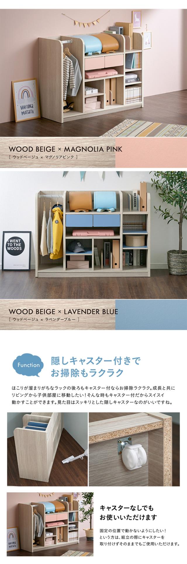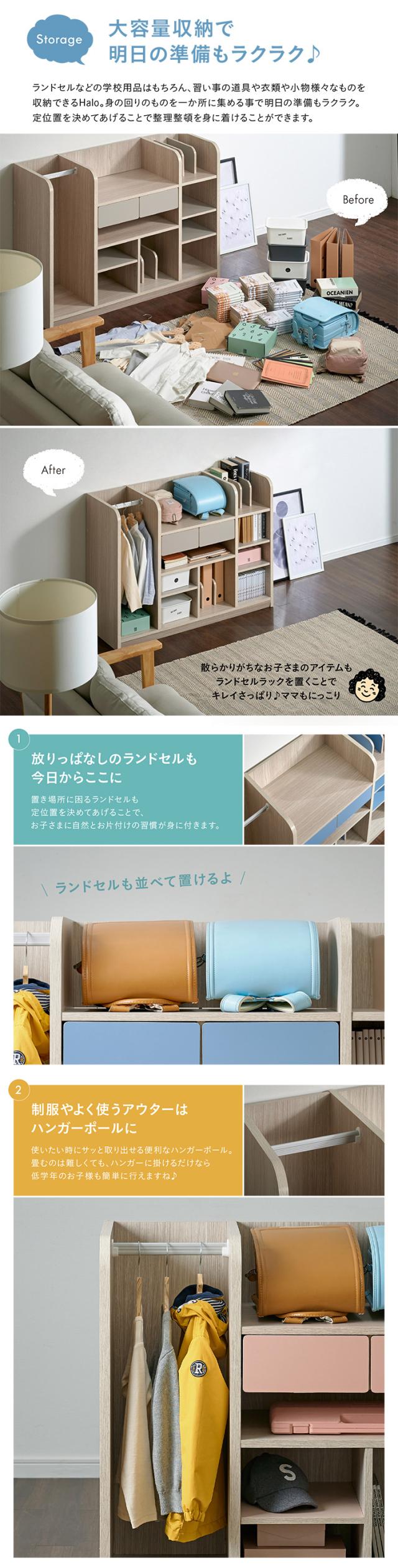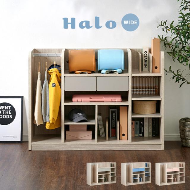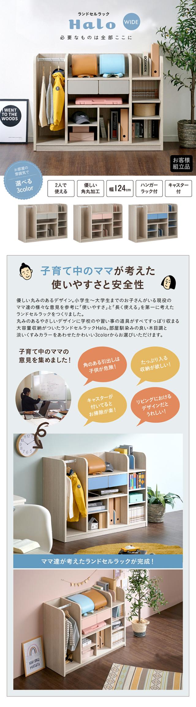 【大容量収納/ハンガーポール付き】ワイド ランドセルラック 幅124cm キャスター付き Halo2(ハロ2) 3色対応 ラック ランドセル収納 本棚 木製 リビングラック ハンガー ハンガーラック