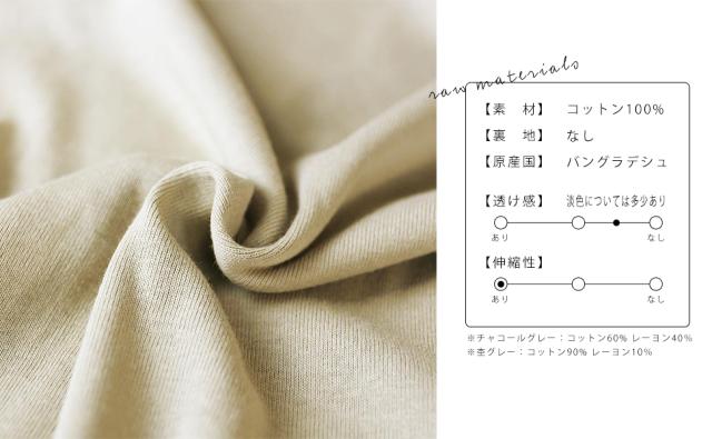 | 【素材】コットン(綿) 100% ※CHACOL GRAY(チャコールグレー):コットン(綿) 60% レーヨン40% ※M-GRAY(杢グレー):コットン(綿) 90% レーヨン10% 【裏地】なし【透け感】多少あり【伸縮性】あり【原産国】バングラデシュ |