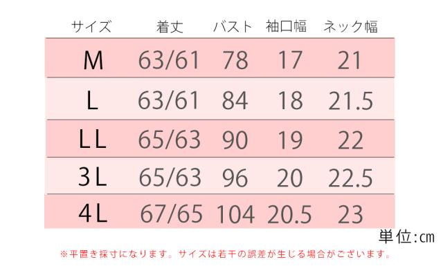 | [Mサイズ]着丈:63/61cm、バスト:78cm、袖口幅:17cm、ネック幅:21cm [Lサイズ]着丈:63/61cm、バスト:84cm、袖口幅:18cm、ネック幅:21.5cm [LLサイズ]着丈:65/63cm、バスト:90cm、袖口幅:19cm、ネック幅:22cm [3Lサイズ]着丈:65/63cm、バスト:96cm、袖口幅:20cm、ネック幅:22.5cm [4Lサイズ]着丈:67/65cm、バスト:104cm、袖口幅:20.5cm、ネック幅:23cm ※平置き実寸サイズとなります為、若干の誤差が生じる場合がございます。 |
