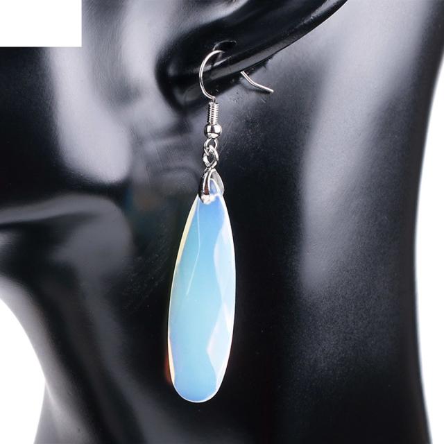 大きなしずく型の合成石のホワイトオパールをセットした天然石風ステンレスピアス。