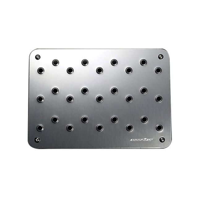 ペダル操作時、ヒールによる磨耗からフロアマットを守ります。2mm厚のアルミ材にバーリング加工を施し、強度の保持とヒールのグリップ確保を実現しました。