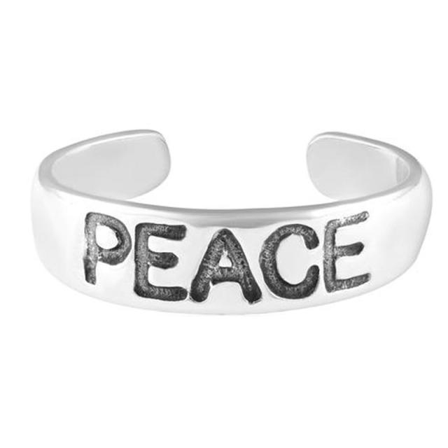 シンプルなフリーサイズのシルバーリングに英語でPEACE(ピース)と平和のメッセージをデザインしたアルファベットの足の指輪トーリング。