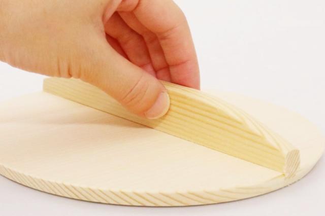 国産スプルスを使用した「落とし蓋」です。煮物の煮崩れを防ぎ、長時間の煮炊きをするのに重宝します。接着剤、くぎ、ネジなどを使用せず、アリ溝式で持ち手をフタにはめているので、丈夫で安心してお使いいただけます。