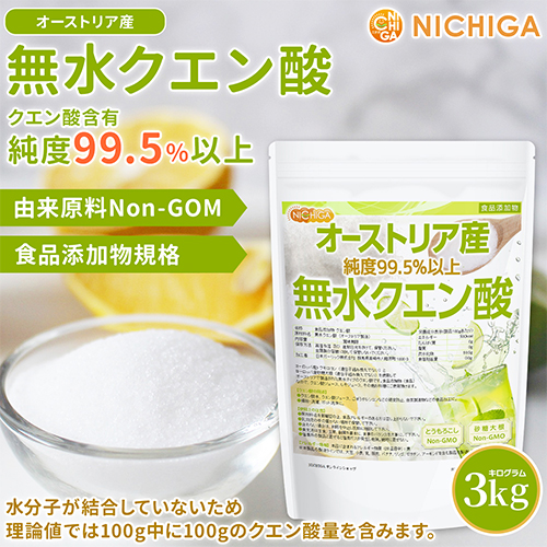 無水クエン酸(オーストリア産) 3kg 食品添加物(食用) Non-GMO 遺伝子組換えでない由来原料使用 Citric acid NICHIGA(ニチガ) TK0