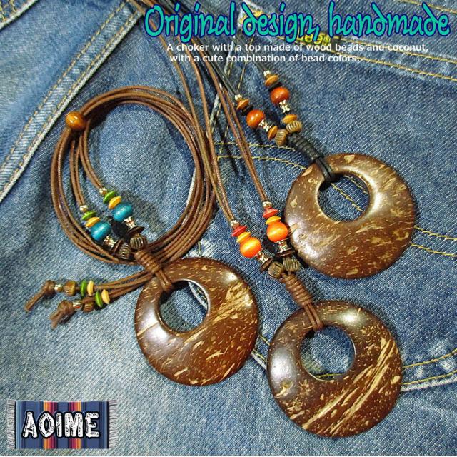 青い目のオリジナル手作りネックレスです。ビーズの色合わせが可愛いウッドビーズとココナツでできたトップのチョーカー。