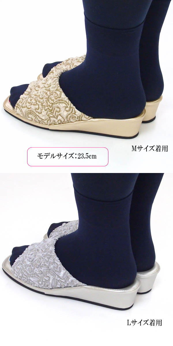 靴下をお履きになる場合や、足幅が広めの方、ゆったりめ がお好みの場合は ワンサイズ大きい品をお選びください。