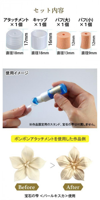 商品詳細:レジン専用着色剤「宝石の雫」にこのアタッチメントを付けて、レジン硬化物や粘土の上にポンポンするだけで、簡単に美しく着色剤を塗る事が出来ます。 生産国:日本 素材・材質:本体:PPキャップ:PEパフ:NBR 商品サイズ:?本体サイズ:H30×Φ18mm (アタッチメント+キャップ) セット内容:【セット詳細】・アタッチメント:H17×Φ18mm?・キャップ:H16×Φ18mm?・パフ小:H12×Φ9mm?・パフ大:H12×Φ13mm・取扱説明書上記セット×5個