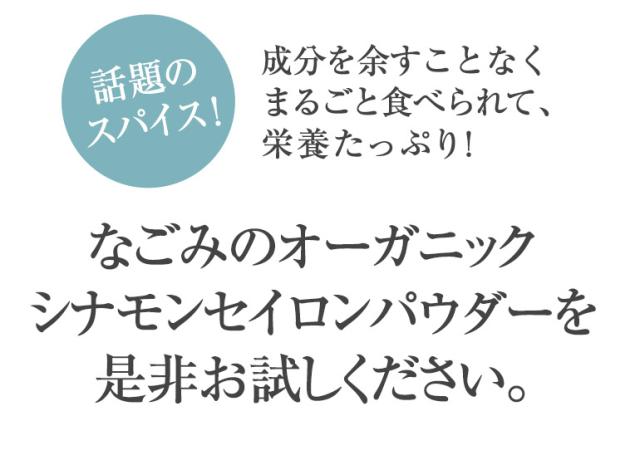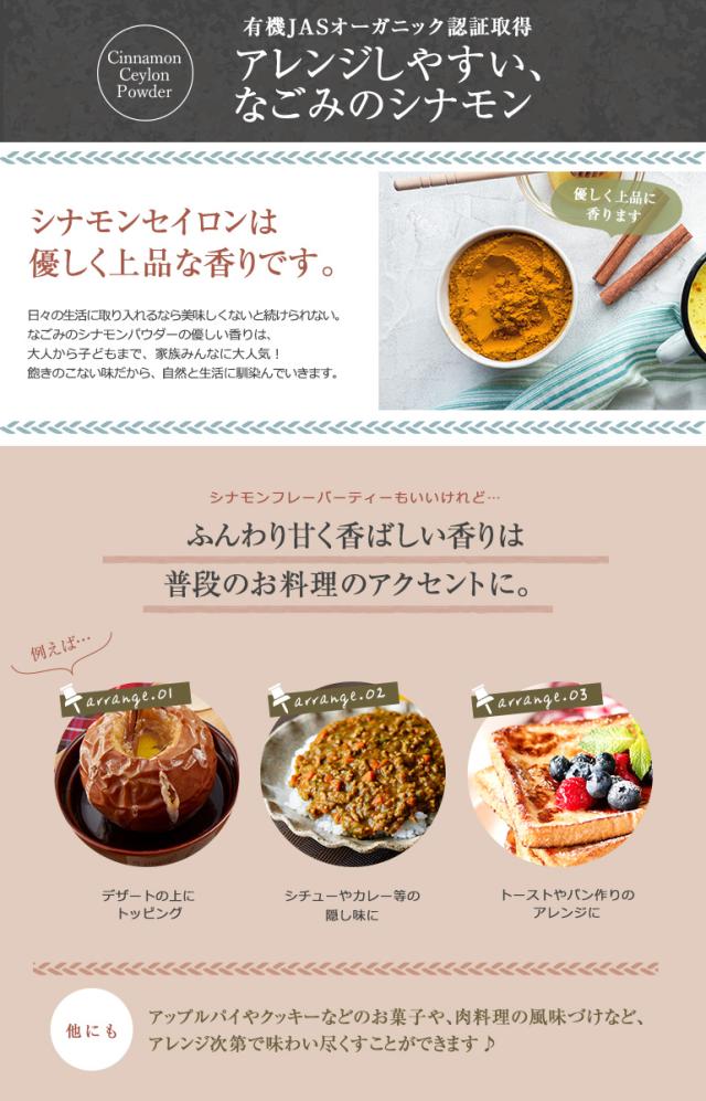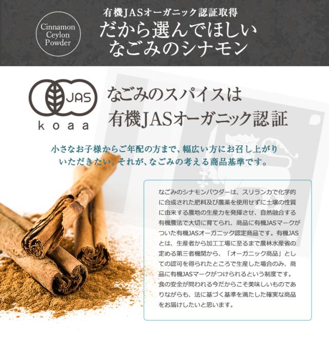 【特徴】有機JAS認証を受けたオーガニックのシナモンパウダー。栄養たっぷり(鉄分・カルシウム・カリウム・ビタミンB1・ビタミンB2)!女性だけでなく、ご家族皆が嬉しい「ぽかぽか温活」「エイジングケア」に大活躍のお手軽パウダー。シナモンは「セイロン」と「カシア」に分かれますが、なごみのシナモンは爽やかで上品な味わいの「セイロン」。クマリン※も少なく、美味しくいただけます。(※クマリン=多量摂取すると肝臓に害を与える恐れがある成分)お料理・お菓子作りのときには完成する直前に加えてお楽しみください。