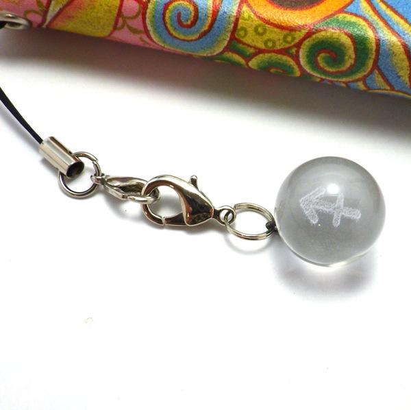 レーザー加工で出来た星座別のマークが入った人工水晶球ストラップです。