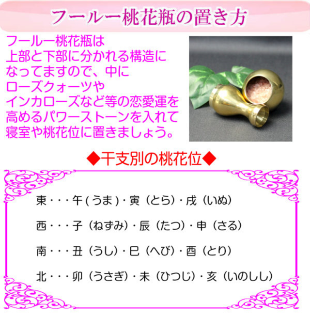 中にローズクォーツを入れ、寝室や桃花位に置いて、恋愛運祈願に!