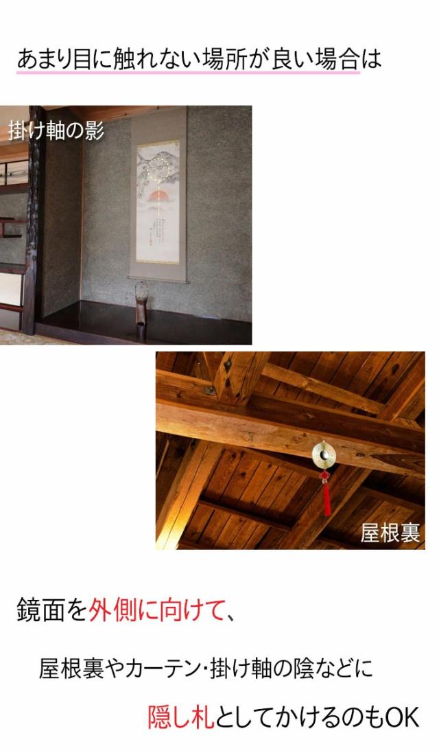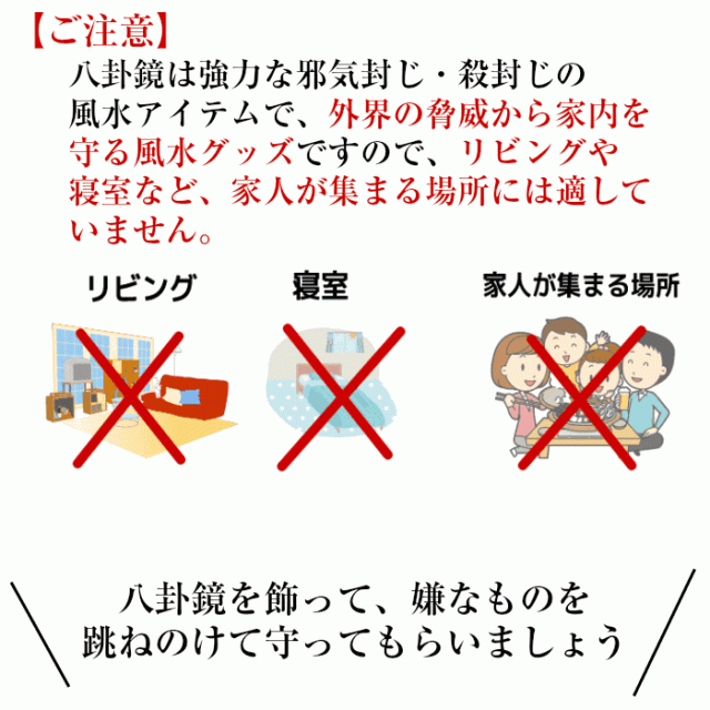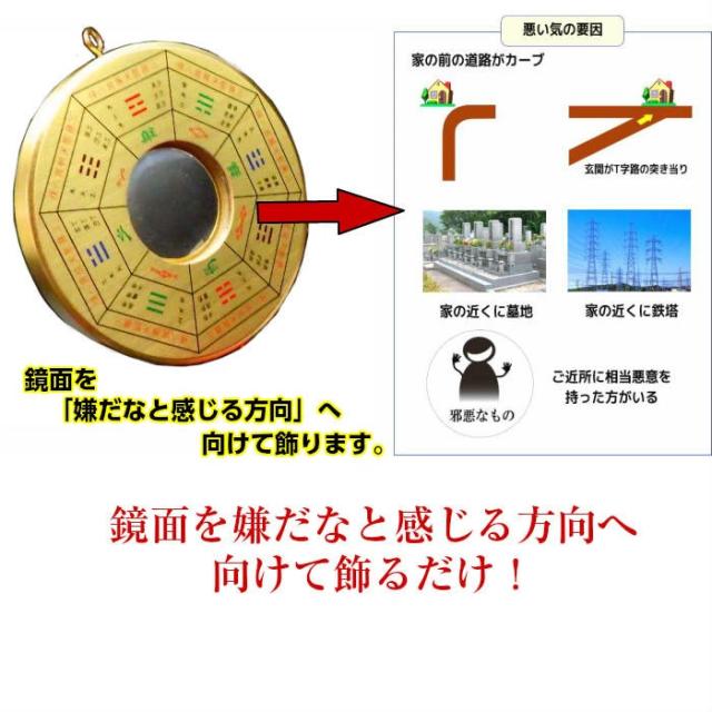 そちらの方向に向けて取り付けを。ご近所トラブル等、嫌なものをはね返し、たちどころに吉相に変えてくれるといわれています。