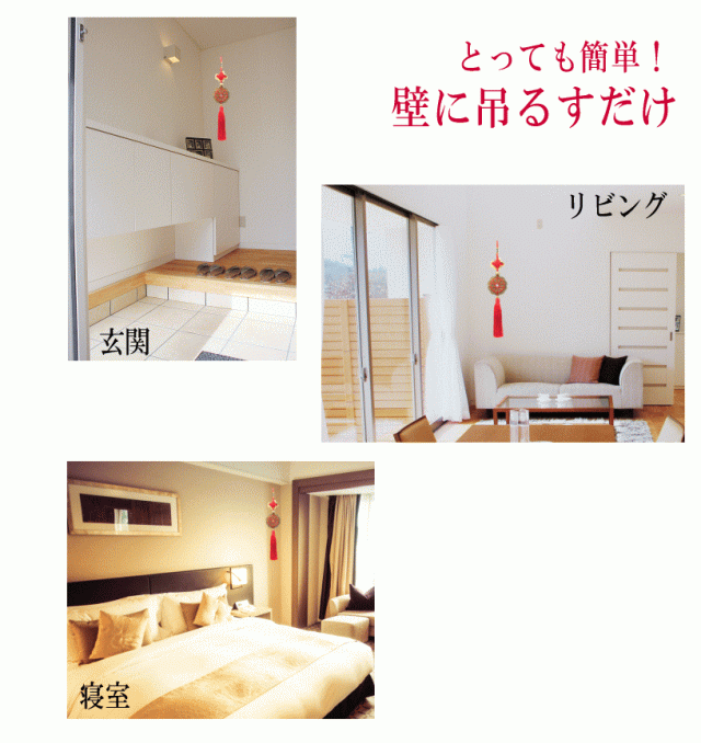 風水八卦銭に刻まれている文言、及び中国結の結び目・房に使用されているひもの色や結び方、房の部分の本数などの細部は商品毎に異なりますが、ご指定になれません。