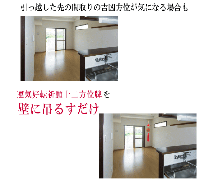 また、引越した先の、間取りの吉凶や方位が心配な場合、「運気好転祈願十二方位牌」を持っていくと移転に伴う凶作用があったとしても安心です。