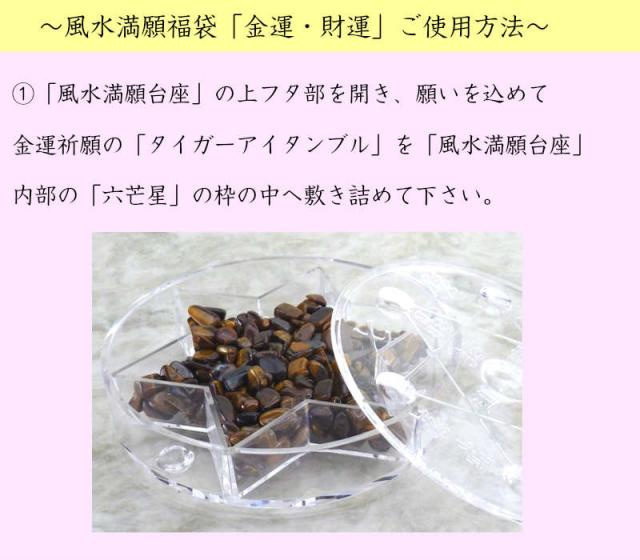 1.『風水満願台座』の上フタ部を開き、願いを込めて金運祈願の『タイガーアイタンブル』を風水満願台座内部の「六芒星」の枠の中へ敷き詰めて下さい。