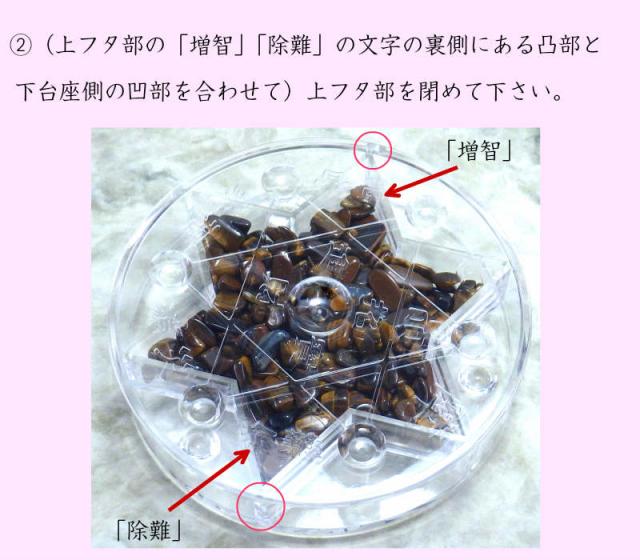 2.(上フタ部の「増智」「除難」の文字の裏側にある凸部と下台座側の凹部を合わせて)上フタ部を閉めて下さい。