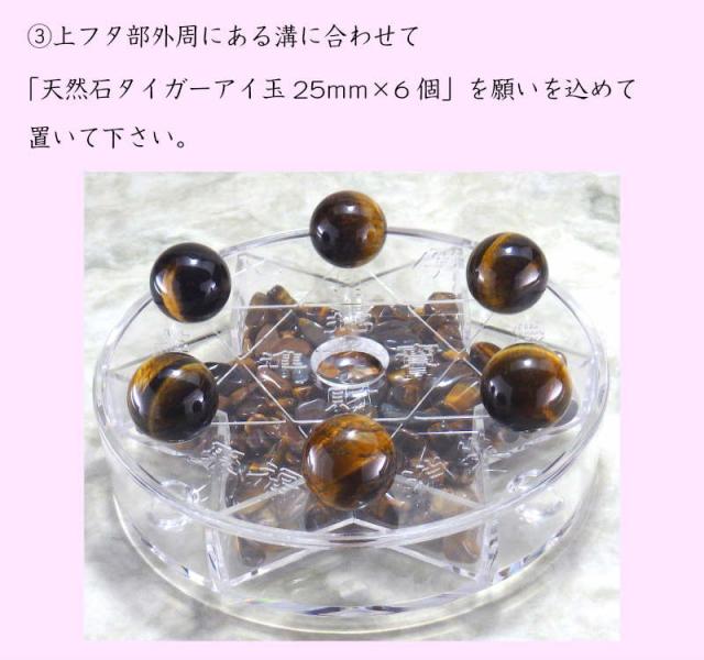 3.上フタ部外周にある溝に合わせて『天然石タイガーアイ玉25mm×6個』を願いを込めて置いて下さい。