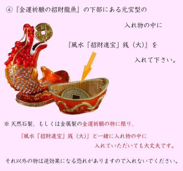 4.『金運祈願の招財龍魚』の下部にある元宝型の入れ物の中に『風水「招財進宝」銭(大)』を入れて下さい。